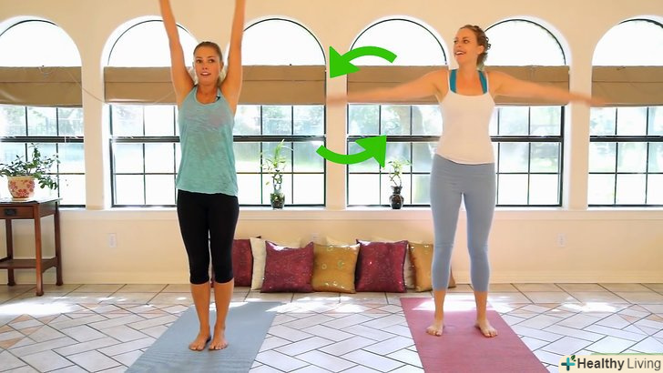 Кругові махи руками.витягніть руки в сторони. Повільно почніть робити кругові махи руками. Почніть з невеликої амплітуди, але потім поступово збільшуйте її, витягаючи руки до стелі і підлоги.[4]- Махайте руками протягом 20-30 секунд, після чого повільно зупиніться і опустіть руки з боків.