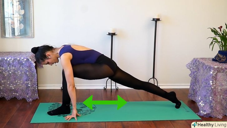 - Додайте динамічну розтяжку.динамічна розтяжка для підготовки до танцювальних рухів може складатися з випадів в позі собаки обличчям вниз. [8] ця розтяжка більш стримана, ніж балістична, але вона розширює амплітуду рухів і готує м'язи до рухів в танці.[9] зробіть випад вперед, поставивши одну ногу перед собою і зігнувши її в коліні. Зігнуте коліно не повинно виступати далі пальців ноги. Покладіть долоні на підлогу по обидві сторони зігнутого коліна. Випряміть зігнуту ногу і поверніть її у вихідне положення, до іншої ноги, при цьому утримуючи їх на ширині плечей. З позиції планка підніміть стегна і підтягніть їх до ніг, не відриваючи ступні від підлоги. Так ви опинитеся в зігнутому положенні.