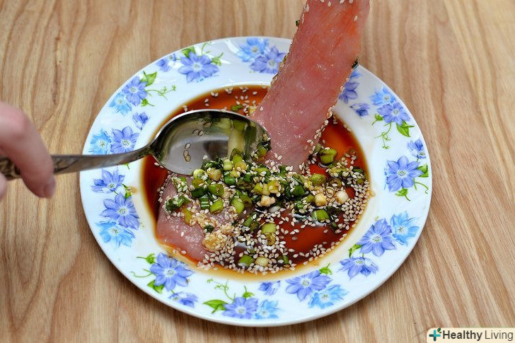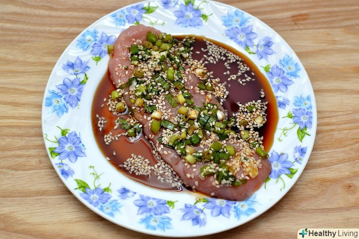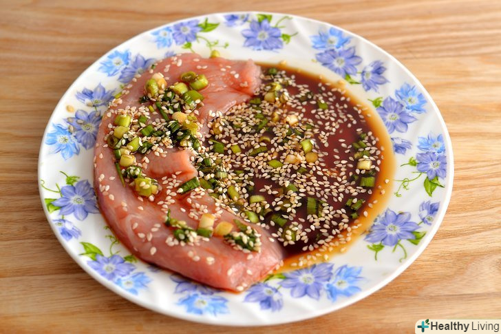 Викладіть м'ясо на плоску тарілку.Замаринуйте м'ясо за допомогою суміші і накрийте блюдо на 12 годин або на ніч. Морепродукти слід маринувати лише протягом двох годин.