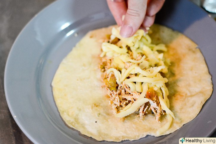 Фаршируйте тортильї.візьміть тортилью і заповніть її кількома чайними ложками курки. Посипте курку невеликою кількістю сиру. Закрутіть рол і покладіть його швом вниз в каструлю, змащену маслом. Повторіть процес з залишилися коржами і куркою.
