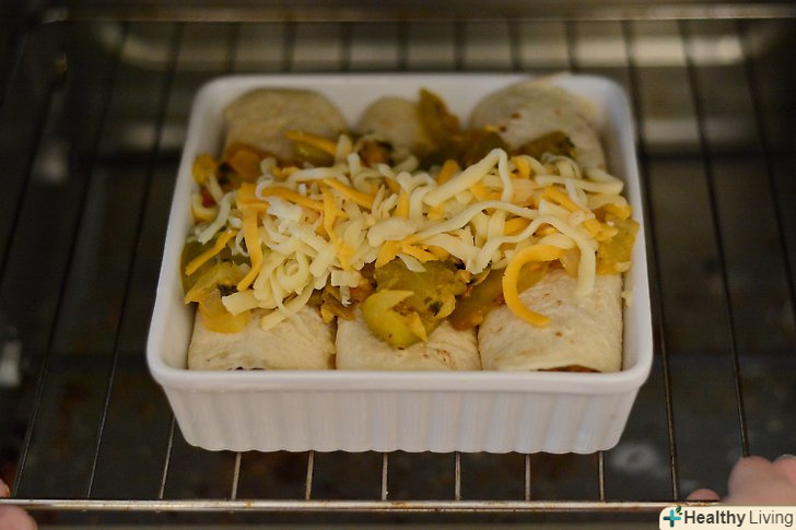 Запікайте енчіладас.Розігрійте духовку до 200 градусів. Поставте енчіладас в духовку, поки сир не стане пузиритися, приблизно на 25 хвилин. Дістаньте енчіладас і подавайте їх гарячими зі сметаною, салатом і чіпсами тортилья.