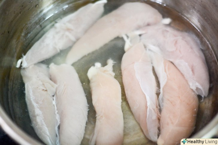 Тушкуйте курку. Помістіть курку у велику каструлю. Додайте приблизно 2-3 см води і чайну ложку солі. Поставте курку на повільний вогонь і залиште на 30 хвилин.- Якщо вам більше подобається смак запеченої курки, тоді покладіть її на сковороду для запікання, полийте оливковою олією і поставте в попередньо розігріту до 176 градусів духовку. Запікайте курку 30 хвилин.