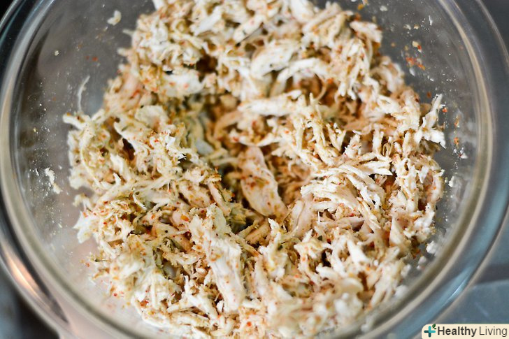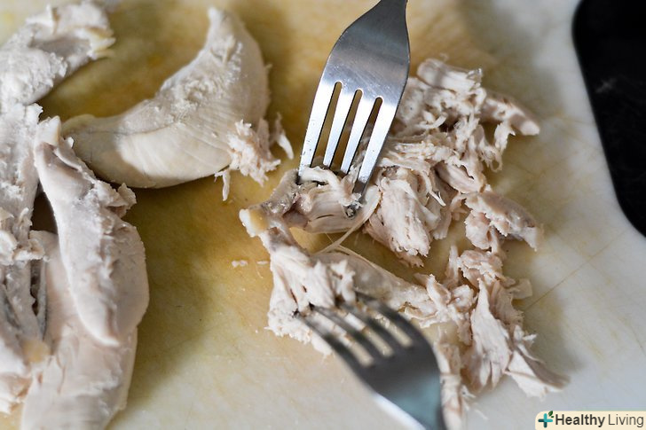 Поріжте курку. Зніміть шкіру з курки. Використовуючи дві вилки, розділіть курку на маленькі частини. Складіть отримані шматочки в одну миску.