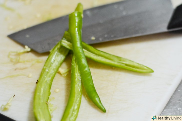 Приготуйте перці чилі. Відріжте верхівки перців і розріжте їх уздовж. Видаліть насіння. Потім поріжте очищені перці.- Намагайтеся не торкатися свого обличчя і очей, поки будете різати Чилі. Можливо, Вам варто надіти рукавички.