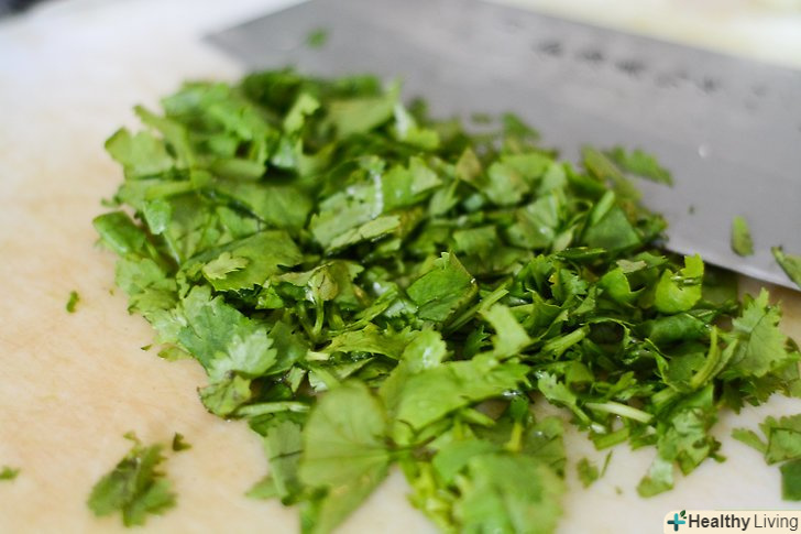 Поріжте інші інгредієнти соусу. Дрібно поріжте часник, цибулю і коріандр.