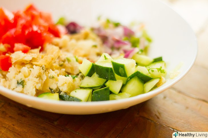 Додайте овочі: скибочки помідорів, моркви і огірків, а також шар картопляного пюре.