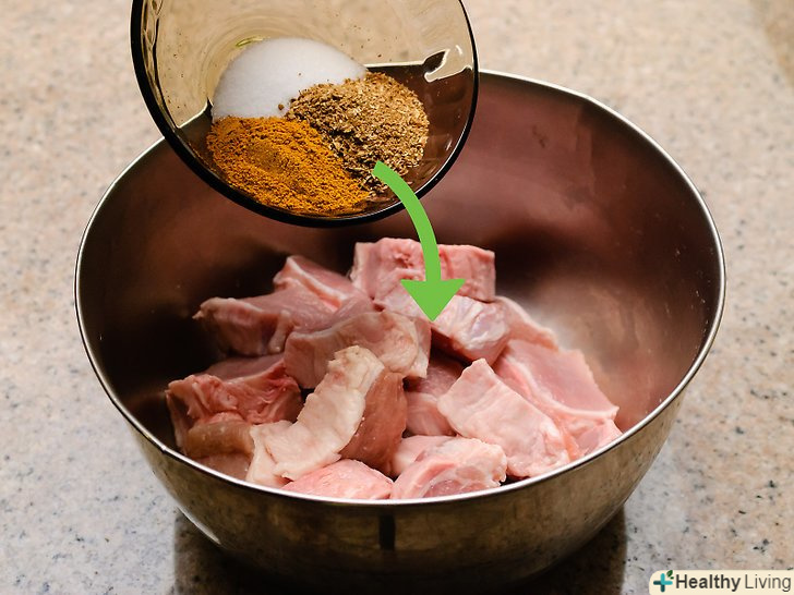 Обваляйте шматочки свинини в спеціях.покладіть м'ясо в миску і посипте спеціями. Щипцями або руками перемішайте шматочки м'яса, щоб вони були повністю покриті. Щедро посоліть і поперчіть і знову перемішайте.- У цьому рецепті можна експериментувати зі спеціями. Якщо ви любите гостру їжу, додайте 1/2 чайної ложки кайенского перцю.