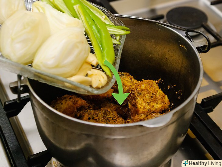 Додайте в жаровню овочі.викладіть їх навколо м'яса так, щоб вони торкалися дна каструлі. Налийте 2,5 або 5 см води і накрийте кришкою.