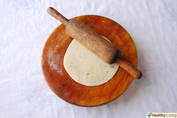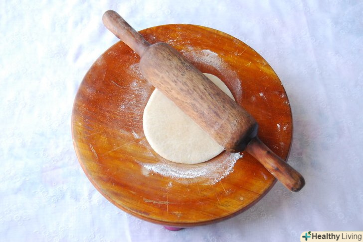 Присипте кульку і робочу поверхню борошном.покладіть кульку на поверхню, притисніть його, а потім качалкою притисніть так, щоб вийшов знак у вигляді плюса. Цим Ви рівномірно розподіліть начинку.