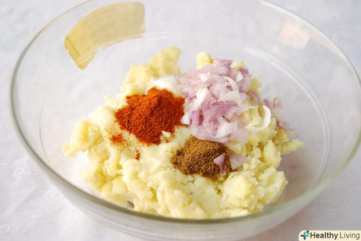 Приготуйте начинку.щоб приготувати начинку, змішайте картопляне пюре з усіма сухими спеціями; додайте цибулю і сіль. Перемішайте так, щоб не залишилося грудочок. Переконайтеся, що начинка не вийшла рідкою.