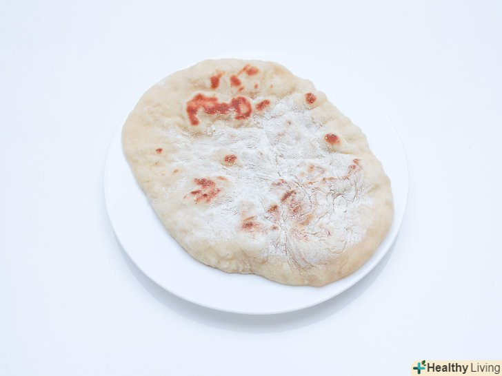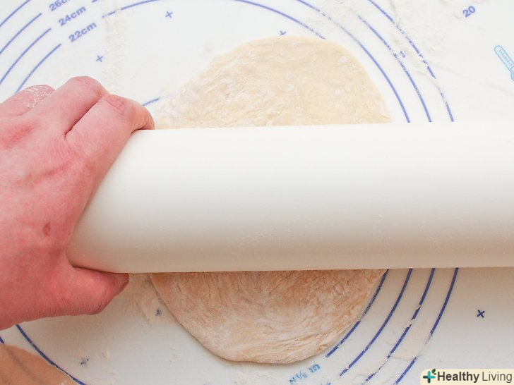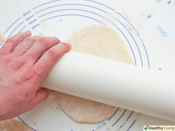 Нехай тісто підніметься перед розкочуванням.накрийте тісто вологим рушником, і нехай піднімається ще 30 хвилин, або поки знову в два рази не збільшиться в розмірі. Після того, як тісто підніметься, використовуйте посипану борошном качалку, щоб розкачати кожен куля тесту в коло менше 2.5 см.товщиною.