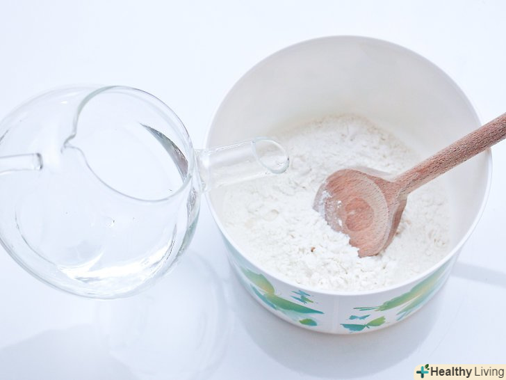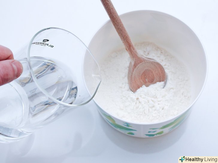 Додайте воду.додайте 1-2 столові ложки (15-30 мл.) води до суміші борошна і перемішайте для зволоження. Потім додайте ще 1/2 склянки (125 мл) води і змішайте все, поки не сформується м'яке тісто.- Зверніть увагу, що може бути важко, змішувати тісто ложкою після додавання 1/2 склянки (125 мл.) води. Якщо це так, покладіть ложку і почніть змішувати тісто руками.