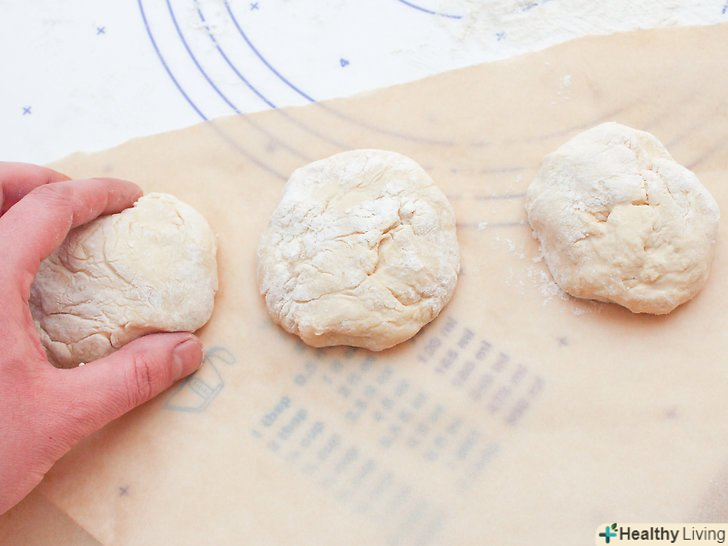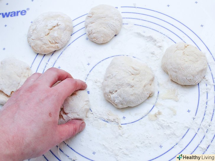 Розділити на більш дрібні шматки.відірвіть невелику кульку з тіста, приблизно, 7.6 - 10 см. в діаметрі. Розкочуйте його між долонями, поки кулька не стане кругліше і м'якше, і покладіть його на деко, викладений пергаментним папером. Повторіть з іншою частиною тесту.- Зверніть увагу, що ви повинні витримувати відстань між кульками, по крайней, мірою, 10 см., коли викладаєте шматочки на деко. У шматочків тіста повинно бути достатньо місця для збільшення, щоб вони не злиплися в процесі приготування.
