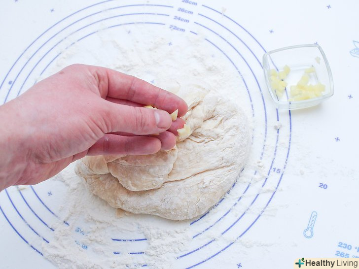 Замісіть з часником.притисніть тісто руками. Розкидайте по ньому подрібнений часник, потім розминайте, щоб розподілити часник по всьому тесту.- Часник тільки за бажанням. Якщо ви не хочете додавати його, просто притисніть тісто і не турбуйтеся про будь-яких додаткових замісах