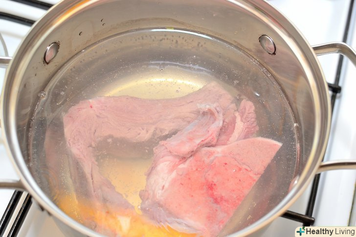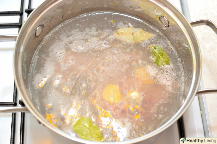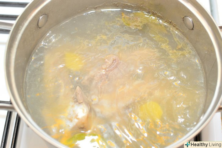 Варіть бульйон на середньому вогні протягом декількох годин, при необхідності додаючи воду.доведіть воду до кипіння, варіть м'ясо на середньому вогні до тих пір, поки воно не стане м'яким. Якщо у вас мало часу, ви можете варити м'ясо 1 годину, але рекомендується варити його на 1-2 години довше, щоб бульйон вийшов більш насиченим. Для досягнення максимально насиченого смаку, варіть бульйон 6 годин на плиті або 2 години в скороварці.- Регулярно перевіряйте кількість води, додавайте воду при необхідності. М'ясо завжди повинно бути покрито водою.