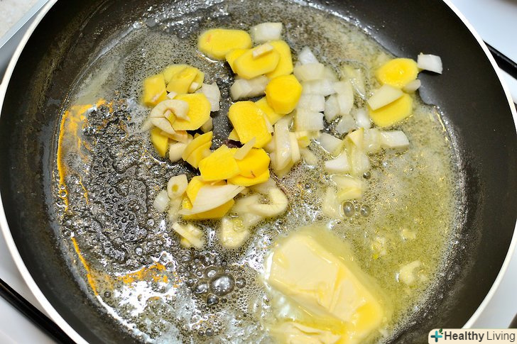 Додайте цибулю, часник і імбир.дрібно наріжте або покришите половину цибулини, можете додати цілу, в залежності від вашого смаку. Покладіть цибулю на сковороду, потім через 1-2 хвилини додайте 2 чайні ложки (10 грам) часникової пасти і 1.5 чайні ложки (7.5 мл) імбирної пасти.- Майте на увазі, що це йде на додаток до імбирної пасти, яку ви використовували в бульйоні. Всі інгредієнти перераховані в окремому розділі вище.