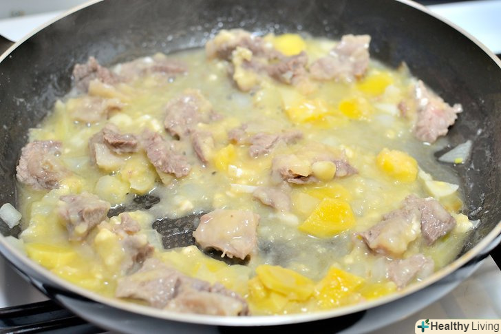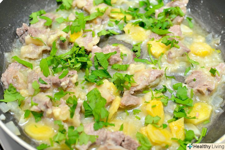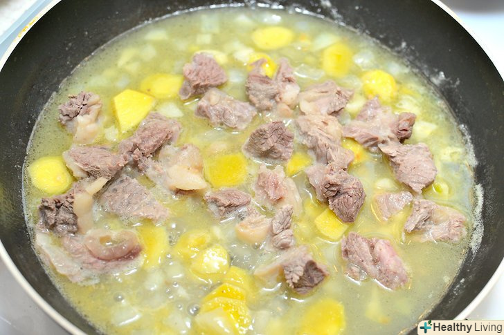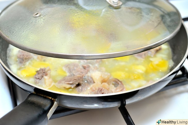 Змішайте борошно і воду, додайте в сковороду.в окремій мисці змішайте 2 столові ложки (30 грам) борошна і 6 столових ложок (90 мл) води, заважайте до тих пір. Поки не вийде однорідна маса.[11] викладіть суміш в сковороду з м'ясом і перемішайте. Накрийте кришкою, тушкуйте ще 10-15 хвилин. Додайте трохи води, якщо рідина википіла.