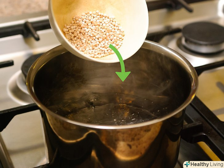 Додайте саго.коли вода закипить, додайте ¼ склянки (43 г) крупи саго. Всипавши крупу, перемішайте і варіть до тих пір, поки вода знову не закипить, не забувайте при цьому періодично помішувати.[2]- В процесі варіння саго потрібно обов'язково перемішувати, оскільки крупа може злипнутися.