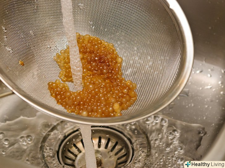 Злийте воду з саго.коли саго досягне бажаної консистенції, злийте зайву воду, виливши вміст каструлі в друшляк. Промийте саго під холодною водою, щоб зупинити процес варіння.[4]