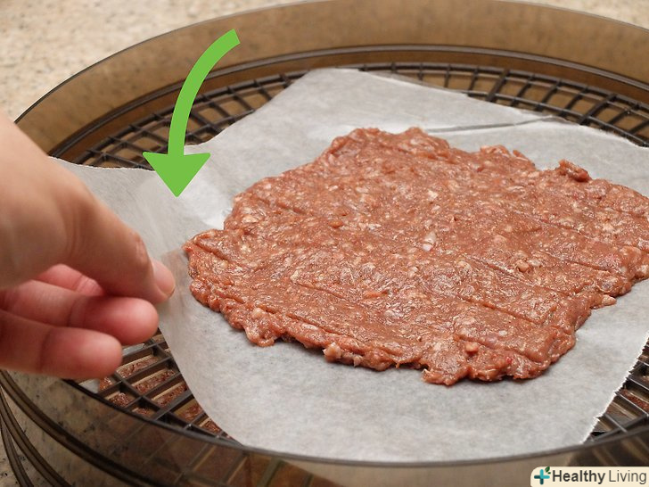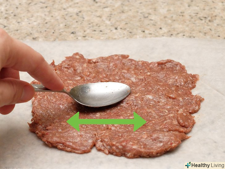 Розкладіть м'ясну суміш на аркуші пергаментного паперу.використовуйте зворотну сторону ложки, щоб рівномірно розкласти м'ясну суміш на аркуші пергаментного паперу, поки вона не стане близько 1/5 дюйма (5 мм) шириною.- Переконайтеся, що пергаментний папір лежить на плоскій поверхні. розкладіть суміш максимально рівно.