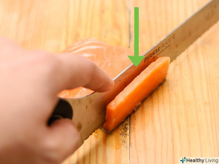 Розріжте лосося на скибочки.дістаньте лосося з морозильника,використовуйте гострий кухонний ніж, щоб розрізати лосось на тонкі скибочки.- Переконайтеся, що кожна смужка приблизно 1/8-1/4 дюйма (3.175 в 6.35 мм) товщиною. Чим тонше смужка, тим швидше вона буде сушитися.