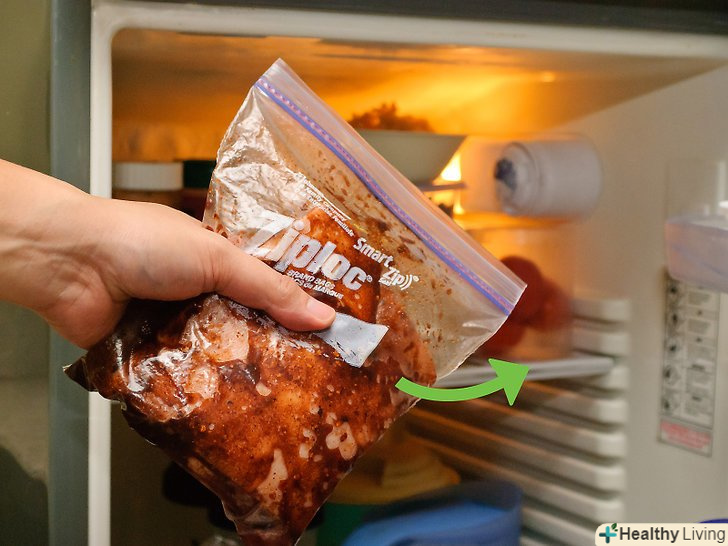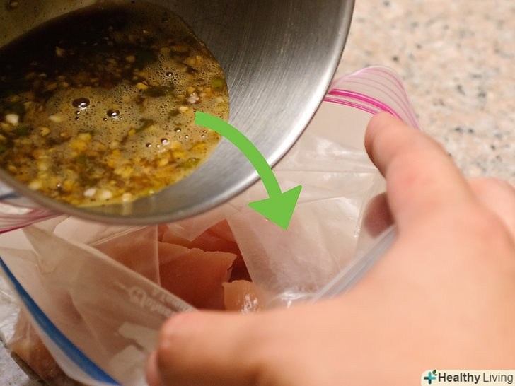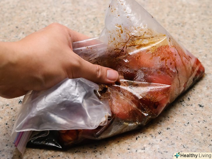 Перемішайте курку в маринаді і залиште.додайте шматочки курки в пакет, нехай вони там знаходяться протягом 20 хвилин, щоб вбрався маринад.- Закрийте мішок і обережно перемішайте курку в маринаді, щоб все м'ясо добре перемішалося.