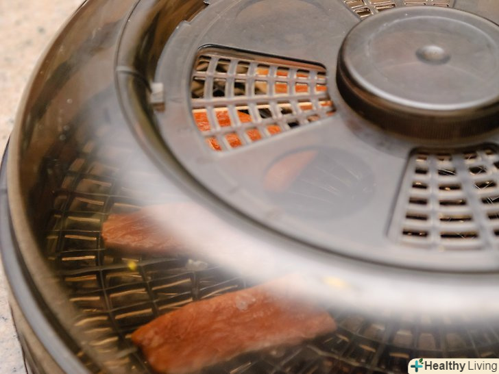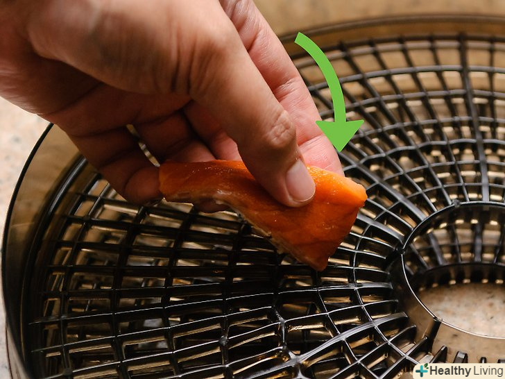 Перенести лосося на сушарку в лотках.помістіть смужки лосося на дегідратор З ЛОТКІВ в один шар.- Після цього, поверніть лотки в сушарку.