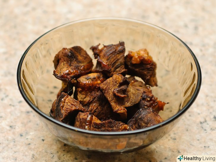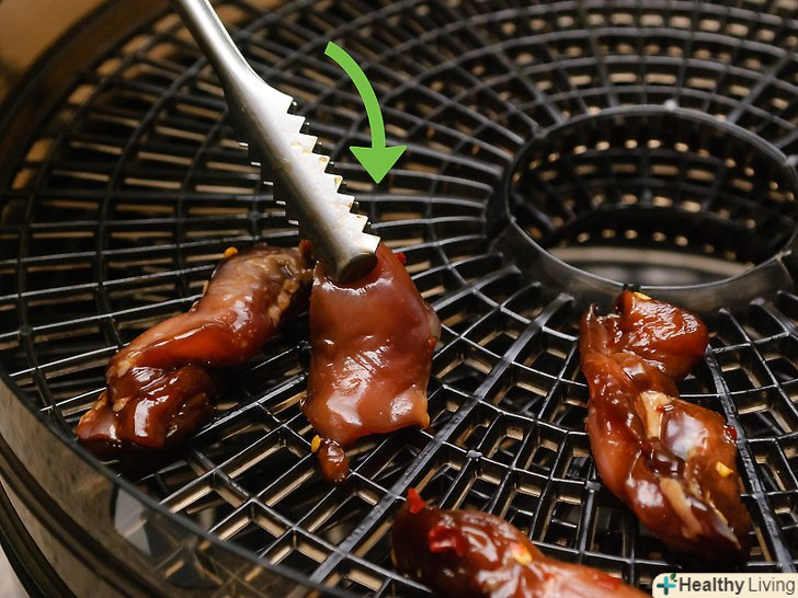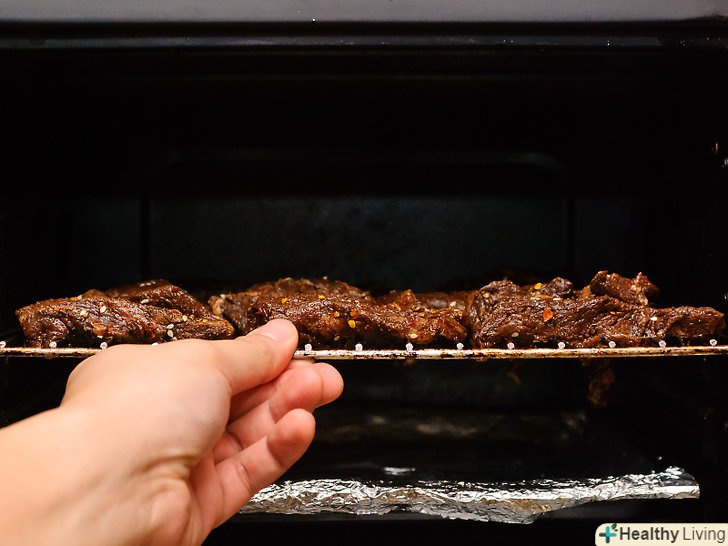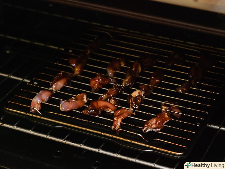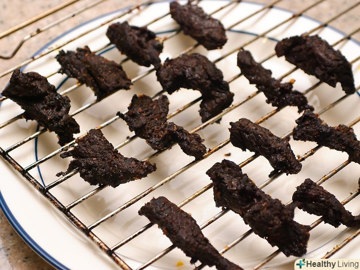 Сушіть від 6 до 12 годин.[1] перевірте в'ялене м'ясо після перших 6 годин. Воно буде готове, якщо центр повністю висохне, і краю почнуть звертатися в хрустку скоринку.- Якщо в'ялене м'ясо не буде готове через 6 годин, продовжуйте запікання, перевіряючи через кожну годину.