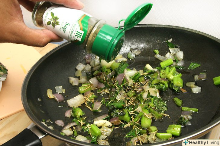 Додайте спеції.додайте до цибулі і селери розмарин, шавлія, чебрець, сіль і перець. Перемішайте суміш дерев'яною ложкою або лопаткою.