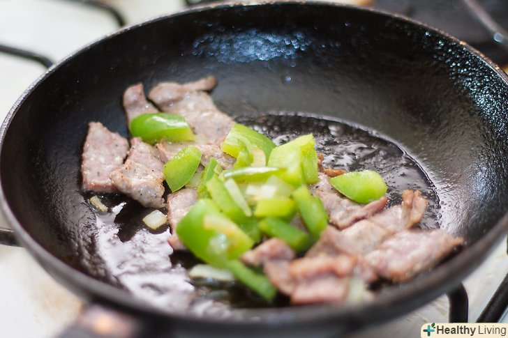 Готуйте м'ясо точно так же, як в першому рецепті.Візьміть напівзаморожений стейк і тонко наріжте. Підсмажуйте цибулю з перцем близько п'яти хвилин а після приберіть зі сковорідки. Готуйте стейк, нарізавши його гострою лопаткою, коли він майже буде готовий. Змішайте цибулю і перець з нарізаним м'ясом.