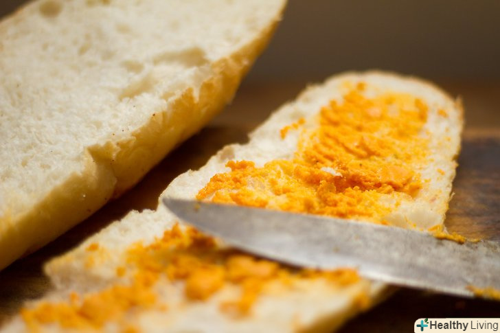 2.намажте булку товстим шаром сирної пасти. У вас два варіанти підігріву вашої булочки і (або) сирної пасти:- Варіант 1: підсмажте булку, а потім намажте сирну пасту на гарячий хліб. Це додасть хлібу приємний хрускіт, але паста швидко охолоне.