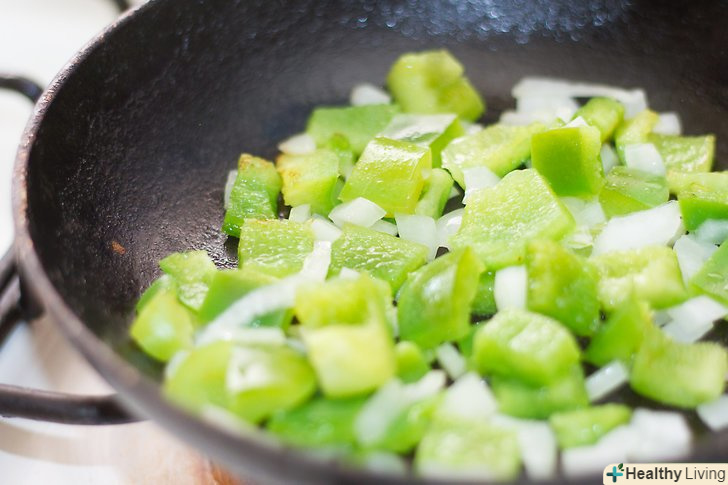 Обсмажуйте на середньому вогні цибулю з перцем близько п'яти хвилин.у велику сковороду налийте нерафіновану рослинну олію, додайте цибулю (при бажанні можете додати і перець), злегка обсмажте до золотистого кольору. Періодично помішуйте і посоліть, якщо потрібно. Обсмажену цибулю пересипте в інший посуд і відставте в сторону.