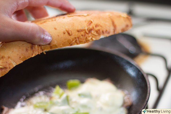 Покладіть розкриту булку зверху на м'ясо і сир, формуючи «дах».яку булку вибрати? Там, де панує сирний стейк, зазвичай беруть Аверсе, Аморосо або Вілотті-Пізанеллі в якості булочки.- Якщо ви не можете знайти булочки цих фірм, Ви можете самі спекти італійську булку або приготувати сендвіч з багетом. Багет більш хрусткий, ніж звичайний хліб, що не дуже зручно, але, все-таки, він досить міцний і легко не розвалиться.