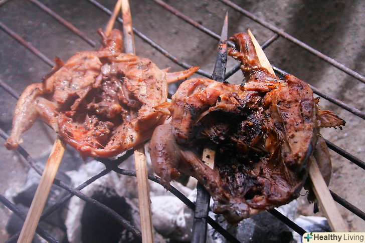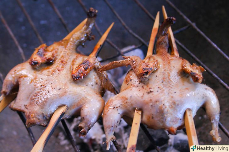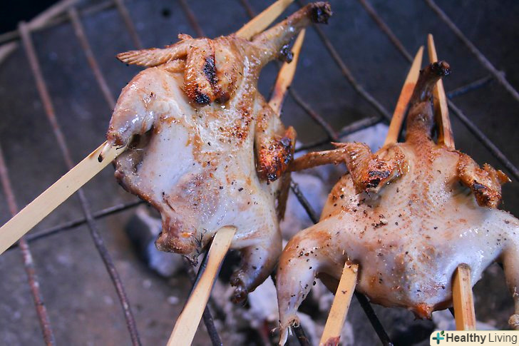 Обсмажте на рашпері перепелів.гострими ножицями видаліть зв'язки і виріжте спинний хребет з тушки кожного птаха. Притисніть перепелів рукою уздовж тулуба, щоб вони лягли плазом.- Утримуйте м'ясо в цьому положенні під час приготування, проткнувши поперек тулуб птиці двома шампурами. Шампури повинні проходити через лапи.