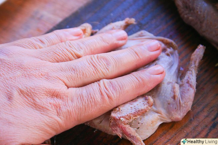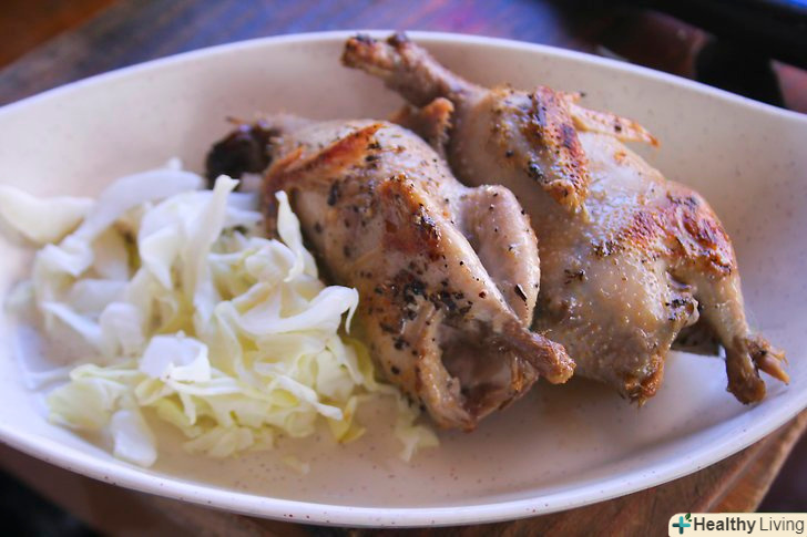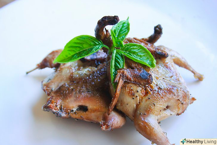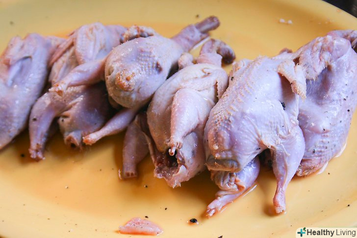 Виберіть велику тушку перепела без плям.при покупці перепелів в магазині віддайте перевагу великому екземпляру, оскільки такий птах містить більше м'яса. Переконайтеся, що на шкірі тушки немає плям.[1]- Шкіра перепелів повинна бути кремових або жовтих тонів з рожевим відтінком.