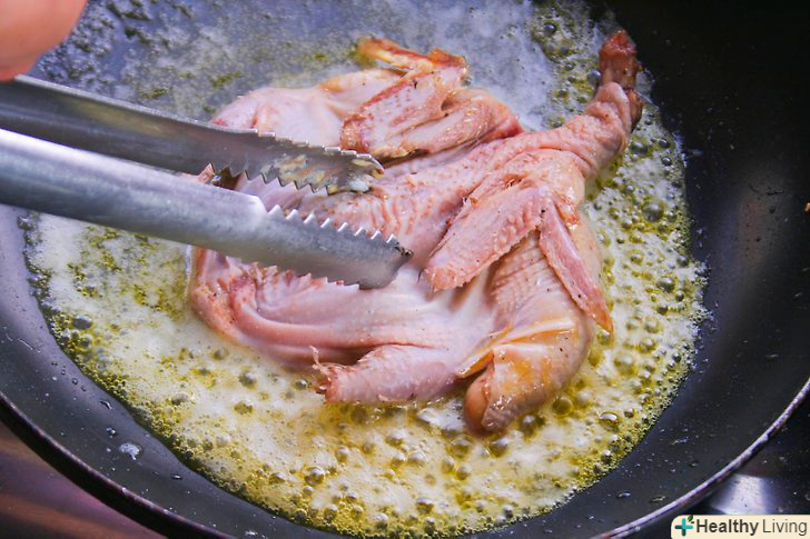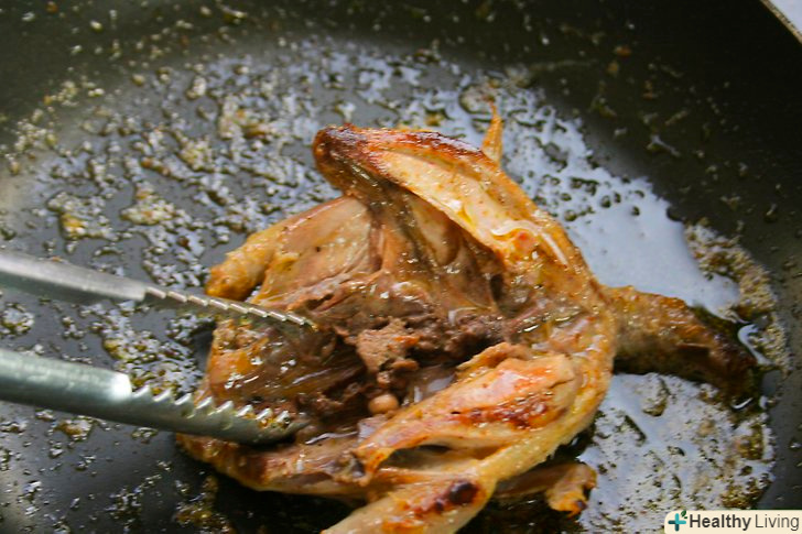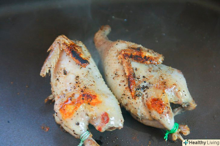 Підрум'яньте перепелів з одного боку.покладіть тушки грудками вниз в гарячу сковороду. Готуйте 4-5 хвилин або поки вони не підрум'яняться з одного боку.[5]- Не перевертайте і не переміщайте м'ясо на цьому етапі. Тушки повинні залишатися в такому положенні, щоб добре підрум'янитися з одного боку.