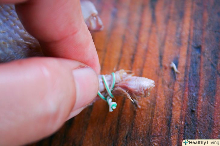 Зв'яжіть лапки птахам.З'єднайте лапи перепелів з заднього боку тушки і зв'яжіть їх харчовою ниткою.- Це допоможе утримати тушку в одному положенні в процесі приготування. Як варіант, можна використовувати палички селери або шампури, щоб зафіксувати птахів на деку.
