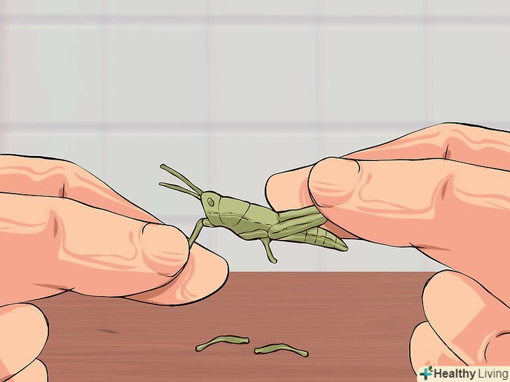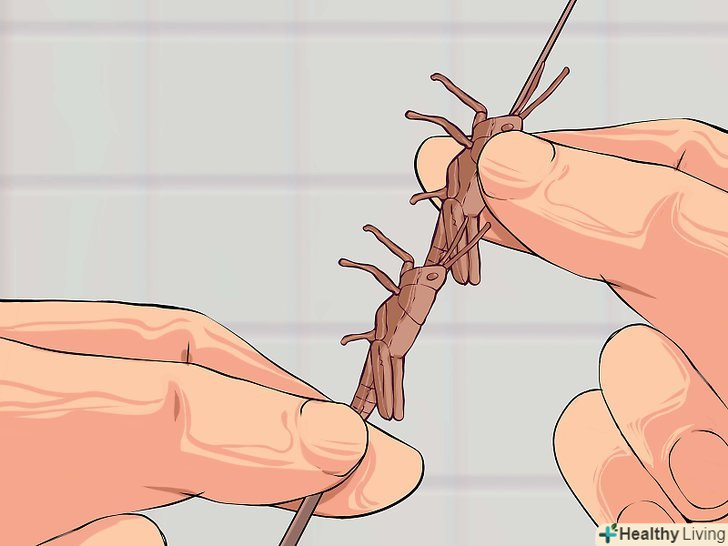 Зніміть ноги та крила.Ноги коників не їстівні; якщо ви з'їсте їх, ви не захворієте, але краще видалити їх перед приготуванням. Те ж саме стосується крил. Деякі кажуть, що заморожування коників протягом 10-15 хвилин або кип'ятіння протягом декількох хвилин полегшує видалення ніг. У цьому також перевага перед їх вбивством.- Деякі люди тягнуть за голову, відразу видаляючи кишки (в тому числі шлунок). Це, як правило , видаляє певні види паразитів (і може знизити ризик, якщо ви хочете їсти коників в сирому вигляді, але все ж краще їх приготувати). Після цього можна вставити палицю в порожнину і смажити його над вогнем.