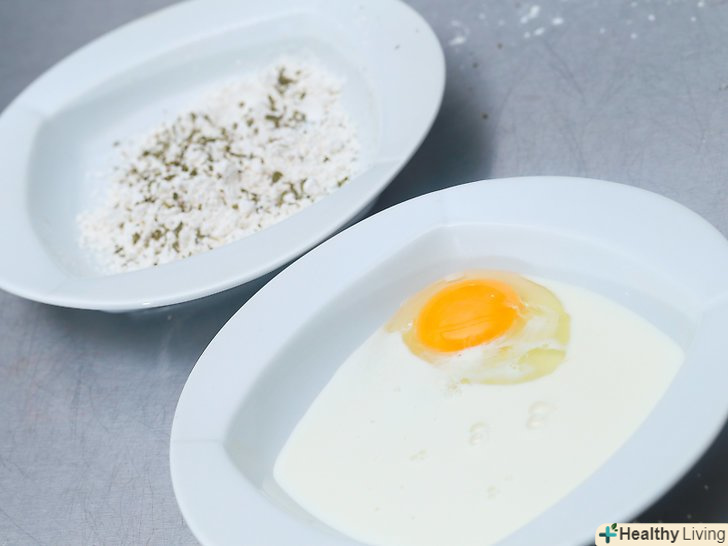Візьміть необхідні інгредієнти для маринаду.насипте борошно в дрібний контейнер. Змішайте яйця і молоко в окремому контейнері. Змішайте розмарин, часник, панірувальні сухарі, сіль і перець в третьому дрібному контейнері.