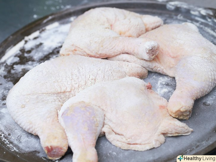 Приправте курку спеціями.змішайте сіль, часниковий порошок, борошно і перець у великому пакеті. Додайте курку в пакет і зав'яжіть його. Струсіть пакет з куркою, поки спеції не розподіляться рівномірно.
