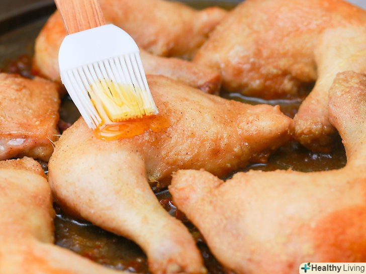 Запікайте курку.помістіть курячі ніжки в форму з розтопленим маслом. За допомогою щипців повністю покрийте ніжки маслом. Випікайте курку протягом 30 хвилин.- Не забувайте надягати рукавиці, щоб не обпектися, коли ви будете виймати форму з духовки. Поставте форму на спеціальну підставку.