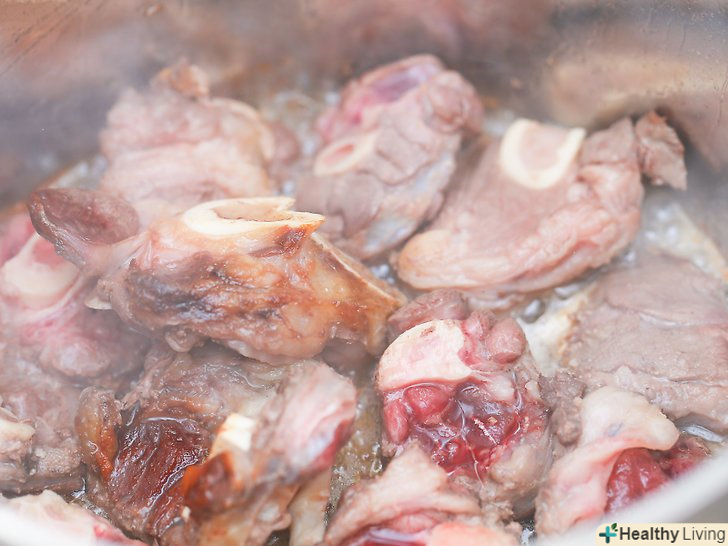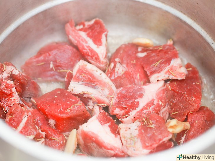 Посипте м'ясо сіллю, і покладіть його в каструлю.готуйте м'ясо, поки воно не засмажиться з усіх боків, а потім перекладіть його в іншу посудину.
