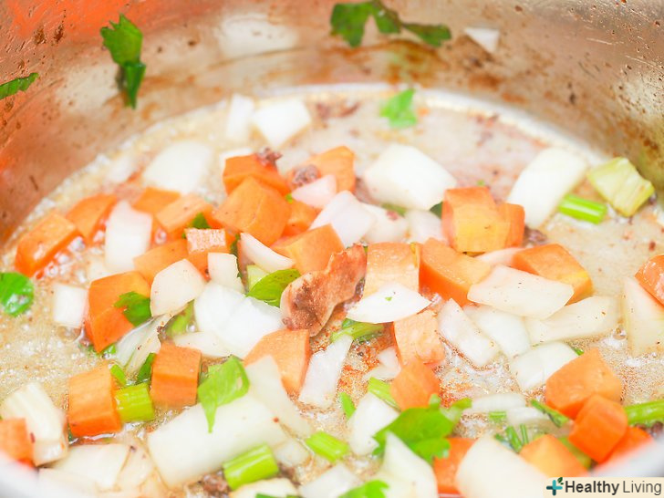 Покладіть в каструлю цибулю, моркву і селеру.обсмажте їх у невеликій кількості олії протягом 5 хвилин, а потім додайте картоплю. Не забувайте часто помішувати. Готуйте ще протягом 2 хвилин.