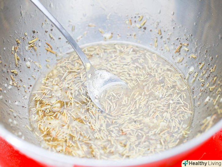 Приготуйте соус.розігрійте сковороду на середньому вогні і викладіть на неї трави, цибулю і сік з м'яса. Додайте курячого бульйону і вино і продовжуйте розігрівати інгредієнти, поки не утвориться соус.- Час від часу помішуйте суміш дерев'яною ложкою.