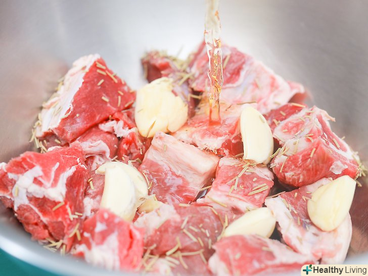 Покладіть м'ясо в середню посудину, а потім вилийте в неї біле вино.потім додайте зубчики часнику і розмарин. Нехай м'ясо маринується в цій суміші протягом 2-3 годин.