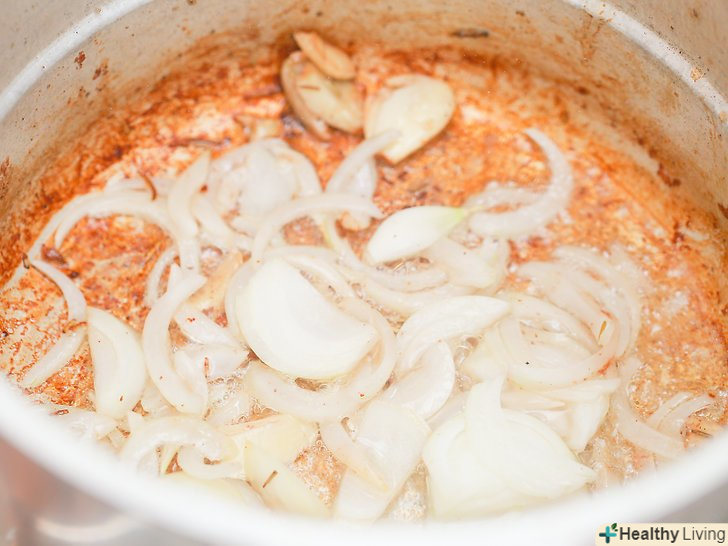 Дістаньте м'ясо, перекладіть його в іншу посудину і відставте.на сковороду додайте цибулю і готуйте його протягом 5 хвилин або поки він не стане м'яким і золотисто-коричневим. Додайте часнику і готуйте ще хвилину.- Час від часу помішуйте все дерев'яною ложкою.