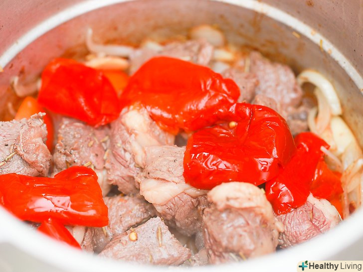 На сковороду викладіть м'ясо, додайте обсмаженого перцю, помідорів, лавровий лист, петрушку і червоного вина.доведіть до кипіння. Потім зменшіть вогонь і кип'ятіть на повільному вогні протягом 15 хвилин. Не накривайте сковорідку кришкою.
