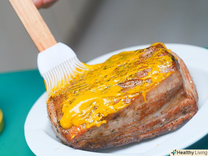 На даному етапі можна ще раз приправити м'ясо.дістаньте свинину з сковороди. Ви можете приправити м'ясо часниковим порошком, чебрецем або ж моєю улюбленою діжонською гірчицею, змішавши ¼ склянки з 1 ст.ложкою меду. Змішайте грунтовно всі приправи і змастіть м'ясо (після того, як посолили і поперчили).