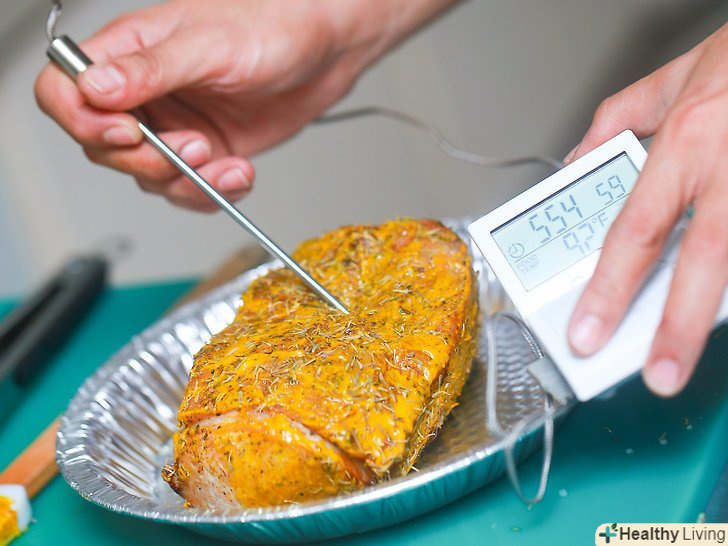При наявності, можете скористатися електронним термометром для м'яса.ці маленькі пристрої мають датчик, прикріплений до дроту, який підключається до таймера. Вставте датчик в товсту частину м'яса, переконайтеся, що він вставлений чітко в середину. Встановіть термометр на температуру 68 градусів Цельсія.