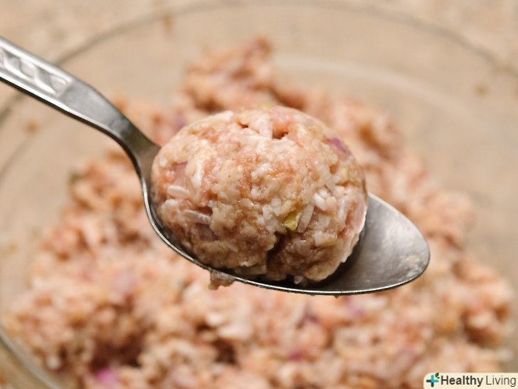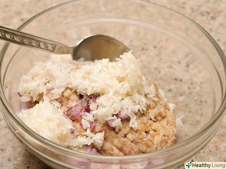 Змішайте м'ясо, рис, 1/2 склянки води, цибулю, сіль, часниковий порошок і перець.